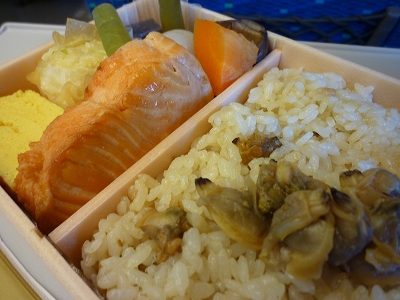 あさりごはんに、焼鮭、卵焼き、煮物に白身魚のすり揚げ、そして煮豆。