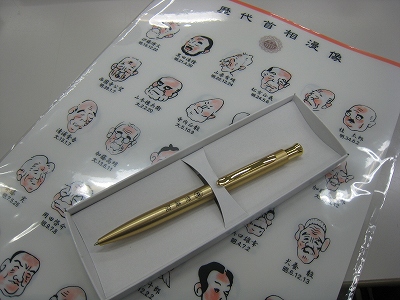 歴代首相の似顔絵入りのクリアファイルとボールペン(金!)