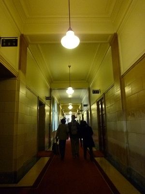 記者が廊下の壁際に立つので、その肘があたるラインが磨かれて白くなっていたり。