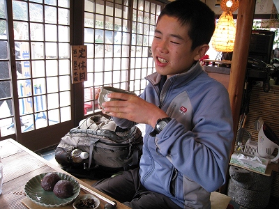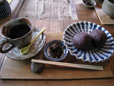 「いいところにお茶屋さん。おおきなおはぎを2個昼メシにする。」
