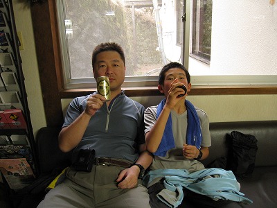温泉につかってさっぱり。ビールとオロナミンCで乾杯です。