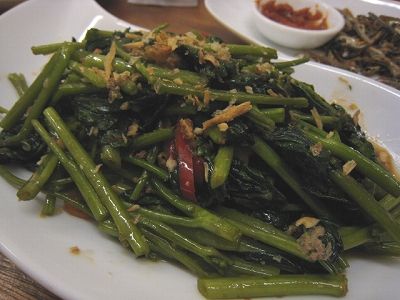 空心菜をサンバルソース(チリソースの一種ですね)でいためたもの。