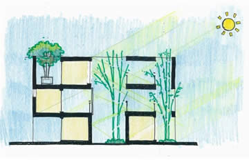 その中に多くの穴をあけて、建物内部に光と風を送り込む関係を作っています。
