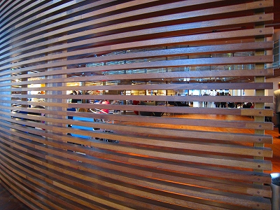 格子に囲まれた円形の待合スペース。